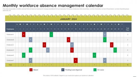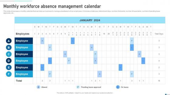 This slide showcases a monthly calendar that can help our business to manage absenteeism of our employees. It includes employees, total absent days, number of absents, number of leave taken, number of pending leave approvals, etc. Make sure to capture your audiences attention in your business displays with our gratis customizable Monthly Workforce Absence Management Calendar Staff Management Approache Guidelines Pdf. These are great for business strategies, office conferences, capital raising or task suggestions. If you desire to acquire more customers for your tech business and ensure they stay satisfied, create your own sales presentation with these plain slides. This slide showcases a monthly calendar that can help our business to manage absenteeism of our employees. It includes employees, total absent days, number of absents, number of leave taken, number of pending leave approvals, etc.