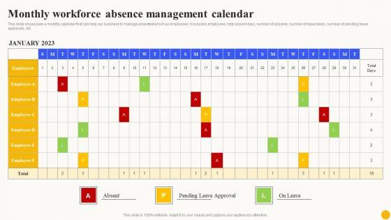 This slide showcases a monthly calendar that can help our business to manage absenteeism of our employees. It includes employees, total absent days, number of absents, number of leave taken, number of pending leave approvals, etc.Make sure to capture your audiences attention in your business displays with our gratis customizable Monthly Workforce Absence Management Strategic Approaches To Streamline Guidelines Pdf. These are great for business strategies, office conferences, capital raising or task suggestions. If you desire to acquire more customers for your tech business and ensure they stay satisfied, create your own sales presentation with these plain slides. This slide showcases a monthly calendar that can help our business to manage absenteeism of our employees. It includes employees, total absent days, number of absents, number of leave taken, number of pending leave approvals, etc.