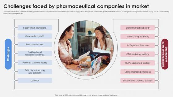 This slide showcases problems faced by pharmaceutical companies. It includes challenges such as supply chain disruptions, slow market growth, reduction in sales, building brand recognition, customer loyalty, low ROI and difficulty in launching new products. Get a simple yet stunning designed Challenges Faced By Pharmaceutical Accelerating Market Share And Profitability MKT SS V. It is the best one to establish the tone in your meetings. It is an excellent way to make your presentations highly effective. So, download this PPT today from Slidegeeks and see the positive impacts. Our easy-to-edit Challenges Faced By Pharmaceutical Accelerating Market Share And Profitability MKT SS V can be your go-to option for all upcoming conferences and meetings. So, what are you waiting for Grab this template today. This slide showcases problems faced by pharmaceutical companies. It includes challenges such as supply chain disruptions, slow market growth, reduction in sales, building brand recognition, customer loyalty, low ROI and difficulty in launching new products.