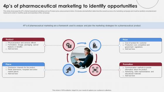 This slide showcases the 4Ps of pharmaceutical marketing such as Product, price, place and promotion. It includes elements that determine the overall success of a marketing campaign and must be carefully considered and balanced in order to meet the goals and objectives of the campaign. Boost your pitch with our creative 4Ps Of Pharmaceutical Marketing To Identify Accelerating Market Share And Profitability MKT SS V. Deliver an awe-inspiring pitch that will mesmerize everyone. Using these presentation templates you will surely catch everyones attention. You can browse the ppts collection on our website. We have researchers who are experts at creating the right content for the templates. So you do not have to invest time in any additional work. Just grab the template now and use them. This slide showcases the 4Ps of pharmaceutical marketing such as Product, price, place and promotion. It includes elements that determine the overall success of a marketing campaign and must be carefully considered and balanced in order to meet the goals and objectives of the campaign.