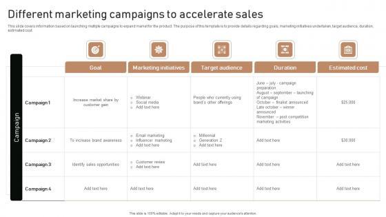 This slide covers information based on launching multiple campaigns to expand market for the product. The purpose of this template is to provide details regarding goals, marketing initiatives undertaken, target audience, duration, estimated cost. Present like a pro with Execution Of Product Lifecycle Different Marketing Campaigns To Accelerate Sales Template Pdf Create beautiful presentations together with your team, using our easy-to-use presentation slides. Share your ideas in real-time and make changes on the fly by downloading our templates. So whether you are in the office, on the go, or in a remote location, you can stay in sync with your team and present your ideas with confidence. With Slidegeeks presentation got a whole lot easier. Grab these presentations today. This slide covers information based on launching multiple campaigns to expand market for the product. The purpose of this template is to provide details regarding goals, marketing initiatives undertaken, target audience, duration, estimated cost.