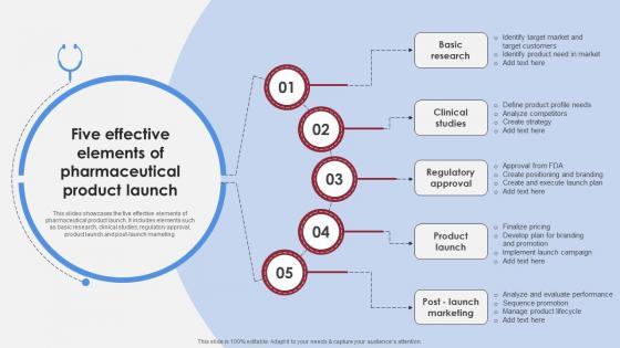This slides showcases the five effective elements of pharmaceutical product launch. It includes elements such as basic research, clinical studies, regulatory approval, product launch and post-launch marketing. If your project calls for a presentation, then Slidegeeks is your go-to partner because we have professionally designed, easy-to-edit templates that are perfect for any presentation. After downloading, you can easily edit Five Effective Elements Of Pharmaceutical Accelerating Market Share And Profitability MKT SS V and make the changes accordingly. You can rearrange slides or fill them with different images. Check out all the handy templates This slides showcases the five effective elements of pharmaceutical product launch. It includes elements such as basic research, clinical studies, regulatory approval, product launch and post-launch marketing.