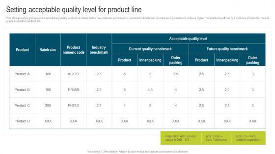 This slide provides glimpse about establishing quality assurance criteria for the raw materials purchased or produced in-house that can help an organization to achieve higher manufacturing efficiency. It includes acceptable material grade, inspection method, etc. Whether you have daily or monthly meetings, a brilliant presentation is necessary. Setting Acceptable Quality Level For Product Line Template PDF can be your best option for delivering a presentation. Represent everything in detail using Setting Acceptable Quality Level For Product Line Template PDF and make yourself stand out in meetings. The template is versatile and follows a structure that will cater to your requirements. All the templates prepared by Slidegeeks are easy to download and edit. Our research experts have taken care of the corporate themes as well. So, give it a try and see the results.
