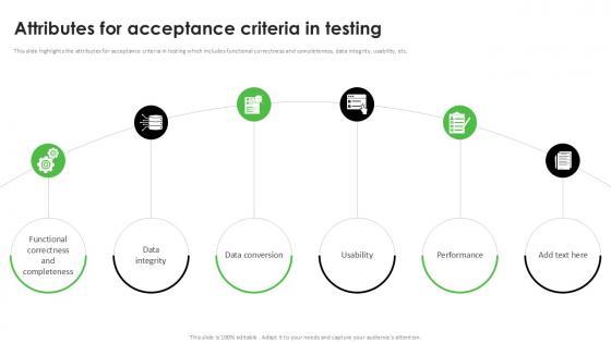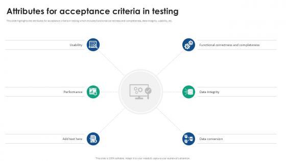 This slide highlights the attributes for acceptance criteria in testing which includes functional correctness and completeness, data integrity, usability, etc. From laying roadmaps to briefing everything in detail, our templates are perfect for you. You can set the stage with your presentation slides. All you have to do is download these easy to edit and customizable templates. Attributes For Acceptance Criteria In Testing Acceptance Testing PPT Slides will help you deliver an outstanding performance that everyone would remember and praise you for. Do download this presentation today. This slide highlights the attributes for acceptance criteria in testing which includes functional correctness and completeness, data integrity, usability, etc.