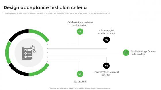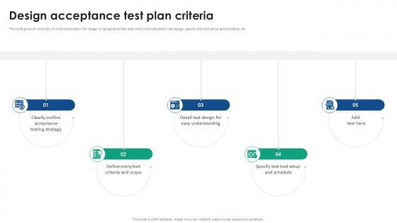 This slide gives an overview of criteria laid down for design of acceptance test plan which includes detail test design, specify test bed setup and schedule, etc. Find a pre-designed and impeccable Design Acceptance Test Plan Criteria Acceptance Testing Strategies Ppt Slides. The templates can ace your presentation without additional effort. You can download these easy-to-edit presentation templates to make your presentation stand out from others. So, what are you waiting for Download the template from Slidegeeks today and give a unique touch to your presentation. This slide gives an overview of criteria laid down for design of acceptance test plan which includes detail test design, specify test bed setup and schedule, etc.