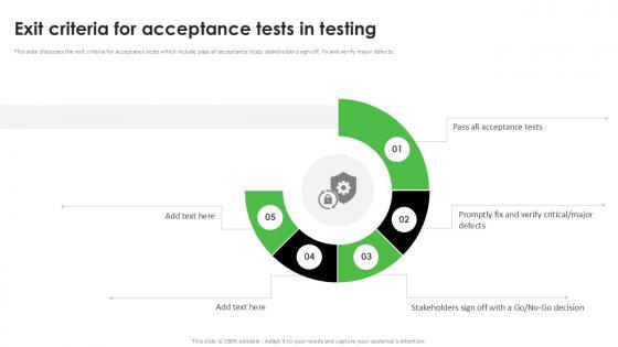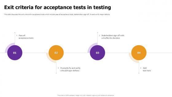This slide discusses the exit criteria for acceptance tests which include pass all acceptance tests, stakeholders sign off, fix and verify major defects. Make sure to capture your audiences attention in your business displays with our gratis customizable Exit Criteria For Acceptance Tests In Testing Acceptance Testing PPT Template. These are great for business strategies, office conferences, capital raising or task suggestions. If you desire to acquire more customers for your tech business and ensure they stay satisfied, create your own sales presentation with these plain slides. This slide discusses the exit criteria for acceptance tests which include pass all acceptance tests, stakeholders sign off, fix and verify major defects.