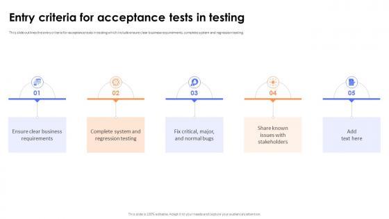 This slide outlines the entry criteria for acceptance tests in testing which include ensure clear business requirements, complete system and regression testing. Crafting an eye catching presentation has never been more straightforward. Let your presentation shine with this tasteful yet straightforward Entry Criteria For Acceptance Tests In Testing Acceptance Testing PPT Template template. It offers a minimalistic and classy look that is great for making a statement. The colors have been employed intelligently to add a bit of playfulness while still remaining professional. Construct the ideal Entry Criteria For Acceptance Tests In Testing Acceptance Testing PPT Template that effortlessly grabs the attention of your audience Begin now and be certain to wow your customers This slide outlines the entry criteria for acceptance tests in testing which include ensure clear business requirements, complete system and regression testing.