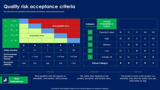 This slide covers risk quantifies from the aspects of individuals, environment, and economy. Do you have to make sure that everyone on your team knows about any specific topic I yes, then you should give Quality Risk Acceptance Criteria Ppt PowerPoint Presentation File Model PDF a try. Our experts have put a lot of knowledge and effort into creating this impeccable Quality Risk Acceptance Criteria Ppt PowerPoint Presentation File Model PDF. You can use this template for your upcoming presentations, as the slides are perfect to represent even the tiniest detail. You can download these templates from the Slidegeeks website and these are easy to edit. So grab these today.