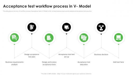 This slide gives an overview of workflow process of acceptance tests in V-Model which includes business requirements analysis and acceptance test execution. Boost your pitch with our creative Acceptance Test Workflow Process In V Model Acceptance Testing Strategies Ppt Sample. Deliver an awe-inspiring pitch that will mesmerize everyone. Using these presentation templates you will surely catch everyones attention. You can browse the ppts collection on our website. We have researchers who are experts at creating the right content for the templates. So you do not have to invest time in any additional work. Just grab the template now and use them. This slide gives an overview of workflow process of acceptance tests in V Model which includes business requirements analysis and acceptance test execution.