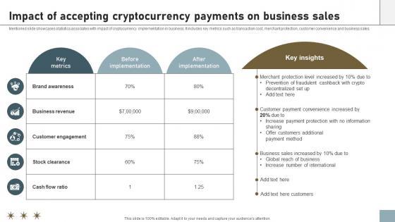 Mentioned slide showcases statistics associates with impact of cryptocurrency implementation in business. It includes key metrics such as transaction cost, merchant protection, customer convenience and business sales. Want to ace your presentation in front of a live audience Our Online Payment Techniques Impact Of Accepting Cryptocurrency Payments can help you do that by engaging all the users towards you. Slidegeeks experts have put their efforts and expertise into creating these impeccable powerpoint presentations so that you can communicate your ideas clearly. Moreover, all the templates are customizable, and easy-to-edit and downloadable. Use these for both personal and commercial use. Mentioned slide showcases statistics associates with impact of cryptocurrency implementation in business. It includes key metrics such as transaction cost, merchant protection, customer convenience and business sales.