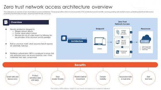 This slide gives an overview of zero trust network access architecture. The purpose of this slide is to showcase the ZTNA architecture and its benefits, covering granting safe and fast access, protecting reliable remote access, protecting sensitive data and apps, stopping insider threats, and so on. Welcome to our selection of the Zero Trust Model Zero Trust Network Access Architecture Overview. These are designed to help you showcase your creativity and bring your sphere to life. Planning and Innovation are essential for any business that is just starting out. This collection contains the designs that you need for your everyday presentations. All of our PowerPoints are 100Percent editable, so you can customize them to suit your needs. This multi-purpose template can be used in various situations. Grab these presentation templates today. This slide gives an overview of zero trust network access architecture. The purpose of this slide is to showcase the ZTNA architecture and its benefits, covering granting safe and fast access, protecting reliable remote access, protecting sensitive data and apps, stopping insider threats, and so on.