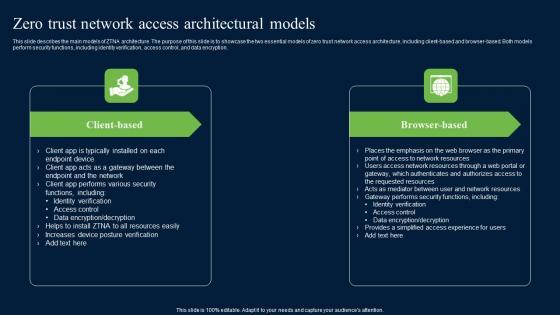 This slide describes the main models of ZTNA architecture. The purpose of this slide is to showcase the two essential models of zero trust network access architecture, including client-based and browser-based. Both models perform security functions, including identity verification, access control, and data encryption. This Zero Trust Model Zero Trust Network Access Architectural Models is perfect for any presentation, be it in front of clients or colleagues. It is a versatile and stylish solution for organizing your meetings. The Zero Trust Model Zero Trust Network Access Architectural Models features a modern design for your presentation meetings. The adjustable and customizable slides provide unlimited possibilities for acing up your presentation. Slidegeeks has done all the homework before launching the product for you. So, do not wait, grab the presentation templates today This slide describes the main models of ZTNA architecture. The purpose of this slide is to showcase the two essential models of zero trust network access architecture, including client-based and browser-based. Both models perform security functions, including identity verification, access control, and data encryption.