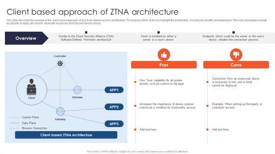 This slide describes the overview of the client-based approach of zero trust network access architecture. The purpose of this slide is to highlight the architecture, including its benefits and drawbacks. The main advantages include its capacity to apply zero trust to all private resources and improved device checks. This modern and well-arranged Zero Trust Network Access Client Based Approach Of ZTNA Architecture provides lots of creative possibilities. It is very simple to customize and edit with the Powerpoint Software. Just drag and drop your pictures into the shapes. All facets of this template can be edited with Powerpoint, no extra software is necessary. Add your own material, put your images in the places assigned for them, adjust the colors, and then you can show your slides to the world, with an animated slide included. This slide describes the overview of the client-based approach of zero trust network access architecture. The purpose of this slide is to highlight the architecture, including its benefits and drawbacks. The main advantages include its capacity to apply zero trust to all private resources and improved device checks.