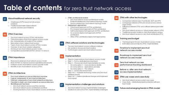 Whether you have daily or monthly meetings, a brilliant presentation is necessary. Table Of Contents For Zero Trust Network Access Ppt Diagram Lists can be your best option for delivering a presentation. Represent everything in detail using Table Of Contents For Zero Trust Network Access Ppt Diagram Lists and make yourself stand out in meetings. The template is versatile and follows a structure that will cater to your requirements. All the templates prepared by Slidegeeks are easy to download and edit. Our research experts have taken care of the corporate themes as well. So, give it a try and see the results. Our Table Of Contents For Zero Trust Network Access Ppt Diagram Lists are topically designed to provide an attractive backdrop to any subject. Use them to look like a presentation pro.