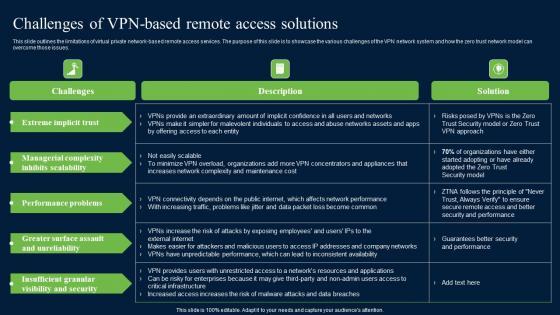 This slide outlines the limitations of virtual private network-based remote access services. The purpose of this slide is to showcase the various challenges of the VPN network system and how the zero trust network model can overcome those issues. There are so many reasons you need a Challenges Of Vpn Based Remote Access Zero Trust Network Security Ideas Pdf. The first reason is you can not spend time making everything from scratch, Thus, Slidegeeks has made presentation templates for you too. You can easily download these templates from our website easily. This slide outlines the limitations of virtual private network-based remote access services. The purpose of this slide is to showcase the various challenges of the VPN network system and how the zero trust network model can overcome those issues.