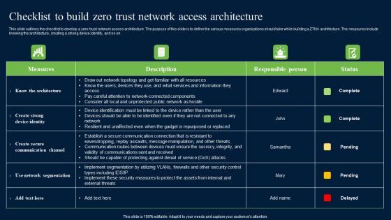 This slide outlines the checklist to develop a zero-trust network access architecture. The purpose of this slide is to define the various measures organizations should take while building a ZTNA architecture. The measures include knowing the architecture, creating a strong device identity, and so on. Do you have to make sure that everyone on your team knows about any specific topic I yes, then you should give Checklist To Build Zero Trust Network Access Security Structure Pdf a try. Our experts have put a lot of knowledge and effort into creating this impeccable Checklist To Build Zero Trust Network Access Security Structure Pdf. You can use this template for your upcoming presentations, as the slides are perfect to represent even the tiniest detail. You can download these templates from the Slidegeeks website and these are easy to edit. So grab these today This slide outlines the checklist to develop a zero-trust network access architecture. The purpose of this slide is to define the various measures organizations should take while building a ZTNA architecture. The measures include knowing the architecture, creating a strong device identity, and so on.