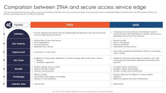 This slide compares the two security models, such as zero trust network architecture and secure access service edge. The purpose of this slide is to highlight the difference between ZTNA and SASE based on definition, key features, deployment, use cases, benefits and challenges. Get a simple yet stunning designed Comparison Between ZTNA And Secure Access Service Edge Zero Trust Network Access. It is the best one to establish the tone in your meetings. It is an excellent way to make your presentations highly effective. So, download this PPT today from Slidegeeks and see the positive impacts. Our easy-to-edit Comparison Between ZTNA And Secure Access Service Edge Zero Trust Network Access can be your go-to option for all upcoming conferences and meetings. So, what are you waiting for Grab this template today. This slide compares the two security models, such as zero trust network architecture and secure access service edge. The purpose of this slide is to highlight the difference between ZTNA and SASE based on definition, key features, deployment, use cases, benefits and challenges.