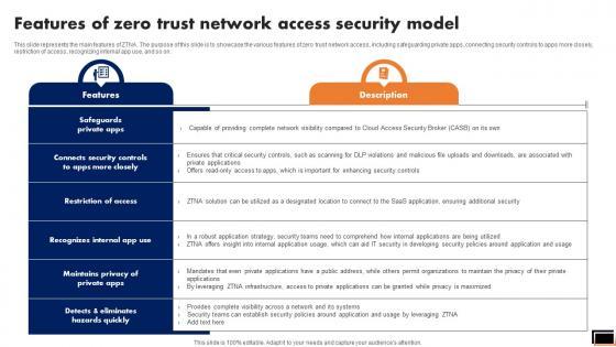 This slide represents the main features of ZTNA. The purpose of this slide is to showcase the various features of zero trust network access, including safeguarding private apps, connecting security controls to apps more closely, restriction of access, recognizing internal app use, and so on. This modern and well-arranged Zero Trust Model Features Of Zero Trust Network Access Security Model provides lots of creative possibilities. It is very simple to customize and edit with the Powerpoint Software. Just drag and drop your pictures into the shapes. All facets of this template can be edited with Powerpoint, no extra software is necessary. Add your own material, put your images in the places assigned for them, adjust the colors, and then you can show your slides to the world, with an animated slide included. This slide represents the main features of ZTNA. The purpose of this slide is to showcase the various features of zero trust network access, including safeguarding private apps, connecting security controls to apps more closely, restriction of access, recognizing internal app use, and so on.