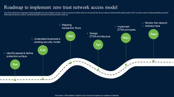This slide outlines the roadmap to implementing an organizations zero-trust network access model. The purpose of this slide is to showcase the various steps to be taken while deploying the ZTNA security model, including assessing current network infrastructure, developing a ZTNA strategy, choosing a ZTNA solution, etc. This Roadmap To Implement Zero Trust Network Access Model Zero Trust Network Security Graphics Pdf from Slidegeeks makes it easy to present information on your topic with precision. It provides customization options, so you can make changes to the colors, design, graphics, or any other component to create a unique layout. It is also available for immediate download, so you can begin using it right away. Slidegeeks has done good research to ensure that you have everything you need to make your presentation stand out. Make a name out there for a brilliant performance. This slide outlines the roadmap to implementing an organizations zero-trust network access model. The purpose of this slide is to showcase the various steps to be taken while deploying the ZTNA security model, including assessing current network infrastructure, developing a ZTNA strategy, choosing a ZTNA solution, etc.