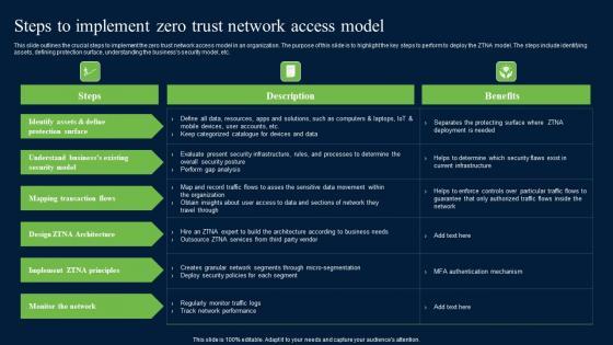 This slide outlines the crucial steps to implement the zero trust network access model in an organization. The purpose of this slide is to highlight the key steps to perform to deploy the ZTNA model. The steps include identifying assets, defining protection surface, understanding the businesss security model, etc. Get a simple yet stunning designed Steps To Implement Zero Trust Network Access Model Zero Trust Network Security Inspiration Pdf. It is the best one to establish the tone in your meetings. It is an excellent way to make your presentations highly effective. So, download this PPT today from Slidegeeks and see the positive impacts. Our easy-to-edit Steps To Implement Zero Trust Network Access Model Zero Trust Network Security Inspiration Pdf can be your go-to option for all upcoming conferences and meetings. So, what are you waiting for Grab this template today. This slide outlines the crucial steps to implement the zero trust network access model in an organization. The purpose of this slide is to highlight the key steps to perform to deploy the ZTNA model. The steps include identifying assets, defining protection surface, understanding the businesss security model, etc.