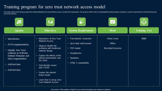 This slide outlines the training program for implementing the zero-trust network access model in the organization. The purpose of this slide is to highlight the training agenda, objectives, system requirements, mode of training and cost of the training. Find a pre-designed and impeccable Training Program For Zero Trust Network Access Model Security Inspiration Pdf. The templates can ace your presentation without additional effort. You can download these easy-to-edit presentation templates to make your presentation stand out from others. So, what are you waiting for Download the template from Slidegeeks today and give a unique touch to your presentation. This slide outlines the training program for implementing the zero-trust network access model in the organization. The purpose of this slide is to highlight the training agenda, objectives, system requirements, mode of training and cost of the training.