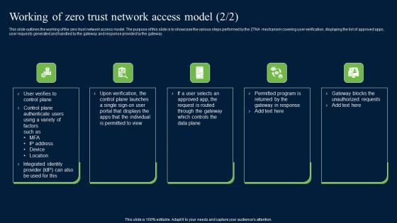 This slide outlines the working of zero trust network access. The purpose of this slide is to demonstrate the workflow of ZTNA, including the principles shared by all ZTNA architectures. The principles include no use of MPLS, hiding the IP addresses, securing devices, IDP and SSO platform, and so on. Slidegeeks is one of the best resources for PowerPoint templates. You can download easily and regulate Working Of Zero Trust Network Access Model Security Pictures Pdf for your personal presentations from our wonderful collection. A few clicks is all it takes to discover and get the most relevant and appropriate templates. Use our Templates to add a unique zing and appeal to your presentation and meetings. All the slides are easy to edit and you can use them even for advertisement purposes. This slide outlines the working of zero trust network access. The purpose of this slide is to demonstrate the workflow of ZTNA, including the principles shared by all ZTNA architectures. The principles include no use of MPLS, hiding the IP addresses, securing devices, IDP and SSO platform, and so on.