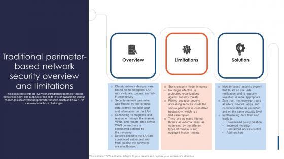 This slide represents the overview of traditional perimeter-based network security. The purpose of this slide is to showcase the various challenges of conventional perimeter-based security and how ZTNA can overcomethose challenges. This Zero Trust Network Access Traditional Perimeter Based Network Security Overview And Limitations is perfect for any presentation, be it in front of clients or colleagues. It is a versatile and stylish solution for organizing your meetings. The Zero Trust Network Access Traditional Perimeter Based Network Security Overview And Limitations features a modern design for your presentation meetings. The adjustable and customizable slides provide unlimited possibilities for acing up your presentation. Slidegeeks has done all the homework before launching the product for you. So, do not wait, grab the presentation templates today This slide represents the overview of traditional perimeter-based network security. The purpose of this slide is to showcase the various challenges of conventional perimeter-based security and how ZTNA can overcomethose challenges.