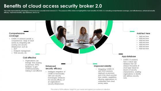 This slide represents the advantages of cloud access security broker version 2.0. The purpose of this slide is to highlight the main benefits of CASB 2.0, including comprehensive coverage, cost-effectiveness, enhanced security efficacy, improved visibility, app database, and so on. Do you have to make sure that everyone on your team knows about any specific topic I yes, then you should give CASB 2 0 IT Benefits Of Cloud Access Security Broker 2 0 a try. Our experts have put a lot of knowledge and effort into creating this impeccable CASB 2 0 IT Benefits Of Cloud Access Security Broker 2 0. You can use this template for your upcoming presentations, as the slides are perfect to represent even the tiniest detail. You can download these templates from the Slidegeeks website and these are easy to edit. So grab these today This slide represents the advantages of cloud access security broker version 2.0. The purpose of this slide is to highlight the main benefits of CASB 2.0, including comprehensive coverage, cost-effectiveness, enhanced security efficacy, improved visibility, app database, and so on.