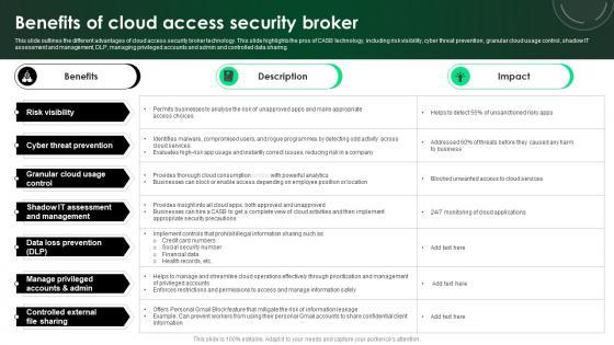 This slide outlines the different advantages of cloud access security broker technology. This slide highlights the pros of CASB technology, including risk visibility, cyber threat prevention, granular cloud usage control, shadow IT assessment and management, DLP, managing privileged accounts and admin and controlled data sharing. There are so many reasons you need a CASB 2 0 IT Benefits Of Cloud Access Security Broker. The first reason is you can not spend time making everything from scratch, Thus, Slidegeeks has made presentation templates for you too. You can easily download these templates from our website easily. This slide outlines the different advantages of cloud access security broker technology. This slide highlights the pros of CASB technology, including risk visibility, cyber threat prevention, granular cloud usage control, shadow IT assessment and management, DLP, managing privileged accounts and admin and controlled data sharing.