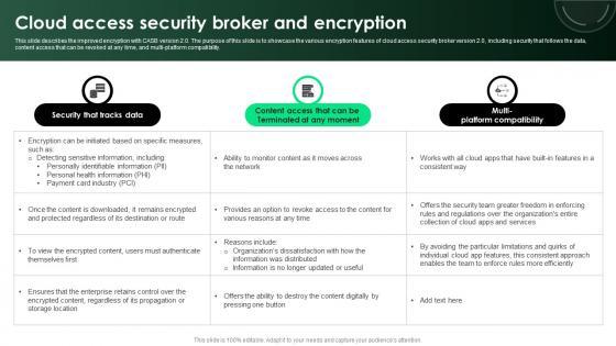 This slide describes the improved encryption with CASB version 2.0. The purpose of this slide is to showcase the various encryption features of cloud access security broker version 2.0, including security that follows the data, content access that can be revoked at any time, and multi-platform compatibility. Presenting this PowerPoint presentation, titled Cloud Access Security Broker And Encryption Ppt PowerPoint Presentation File Example PDF, with topics curated by our researchers after extensive research. This editable presentation is available for immediate download and provides attractive features when used. Download now and captivate your audience. Presenting this Cloud Access Security Broker And Encryption Ppt PowerPoint Presentation File Example PDF. Our researchers have carefully researched and created these slides with all aspects taken into consideration. This is a completely customizable Cloud Access Security Broker And Encryption Ppt PowerPoint Presentation File Example PDF that is available for immediate downloading. Download now and make an impact on your audience. Highlight the attractive features available with our PPTs.