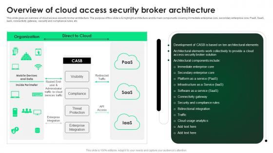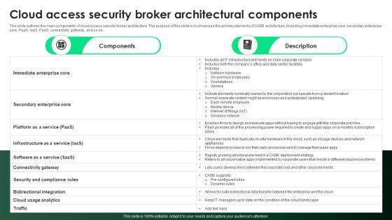 This slide outlines the main components of cloud access security broker architecture. The purpose of this slide is to showcase the primary elements of CASB architecture, including immediate enterprise core, secondary enterprise core, PaaS, IaaS, PaaS, connectivity gateway, and so on. This modern and well-arranged CASB 2 0 IT Cloud Access Security Broker Architectural Components provides lots of creative possibilities. It is very simple to customize and edit with the Powerpoint Software. Just drag and drop your pictures into the shapes. All facets of this template can be edited with Powerpoint, no extra software is necessary. Add your own material, put your images in the places assigned for them, adjust the colors, and then you can show your slides to the world, with an animated slide included. This slide outlines the main components of cloud access security broker architecture. The purpose of this slide is to showcase the primary elements of CASB architecture, including immediate enterprise core, secondary enterprise core, PaaS, IaaS, PaaS, connectivity gateway, and so on.