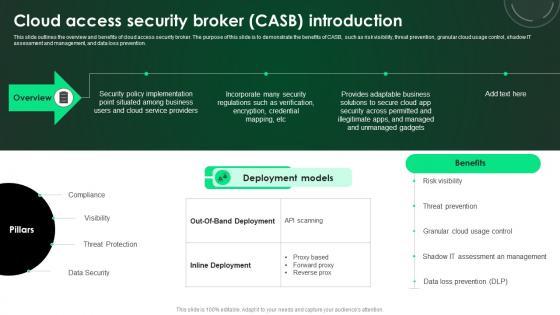 This slide outlines the overview and benefits of cloud access security broker. The purpose of this slide is to demonstrate the benefits of CASB, such as risk visibility, threat prevention, granular cloud usage control, shadow IT assessment and management, and data loss prevention. This CASB 2 0 IT Cloud Access Security Broker CASB Introduction is perfect for any presentation, be it in front of clients or colleagues. It is a versatile and stylish solution for organizing your meetings. The CASB 2 0 IT Cloud Access Security Broker CASB Introduction features a modern design for your presentation meetings. The adjustable and customizable slides provide unlimited possibilities for acing up your presentation. Slidegeeks has done all the homework before launching the product for you. So, do not wait, grab the presentation templates today This slide outlines the overview and benefits of cloud access security broker. The purpose of this slide is to demonstrate the benefits of CASB, such as risk visibility, threat prevention, granular cloud usage control, shadow IT assessment and management, and data loss prevention.