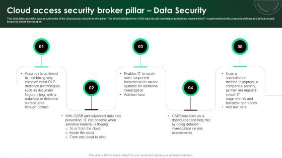 This slide talks about the data security pillar of the cloud access security broker pillar. This slide highlights how CASB data security can help organizations improve their IT requirements and business operations and detect security breaches before they happen. The CASB 2 0 IT Cloud Access Security Broker Pillar Data Security is a compilation of the most recent design trends as a series of slides. It is suitable for any subject or industry presentation, containing attractive visuals and photo spots for businesses to clearly express their messages. This template contains a variety of slides for the user to input data, such as structures to contrast two elements, bullet points, and slides for written information. Slidegeeks is prepared to create an impression. This slide talks about the data security pillar of the cloud access security broker pillar. This slide highlights how CASB data security can help organizations improve their IT requirements and business operations and detect security breaches before they happen.