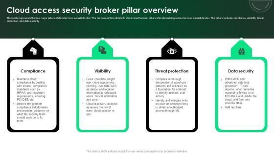 This slide represents the four major pillars of cloud access security broker. The purpose of this slide is to showcase the main pillars of implementing a cloud access security broker. The pillars include compliance, visibility, threat protection, and data security. Are you searching for a CASB 2 0 IT Cloud Access Security Broker Pillar Overview that is uncluttered, straightforward, and original Its easy to edit, and you can change the colors to suit your personal or business branding. For a presentation that expresses how much effort you have put in, this template is ideal With all of its features, including tables, diagrams, statistics, and lists, its perfect for a business plan presentation. Make your ideas more appealing with these professional slides. Download CASB 2 0 IT Cloud Access Security Broker Pillar Overview from Slidegeeks today. This slide represents the four major pillars of cloud access security broker. The purpose of this slide is to showcase the main pillars of implementing a cloud access security broker. The pillars include compliance, visibility, threat protection, and data security.