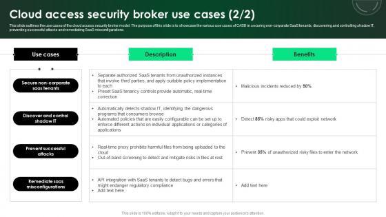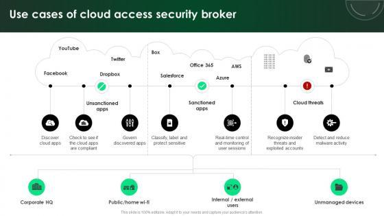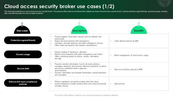 This slide represents the use cases of cloud access security broker. The purpose of this slide is to showcase the multiple use cases of cloud access security broker, covering protection against threats, governing usage, securing data, and enforcing data loss and compliance policies. Presenting this PowerPoint presentation, titled CASB 2 0 IT Cloud Access Security Broker Use Cases, with topics curated by our researchers after extensive research. This editable presentation is available for immediate download and provides attractive features when used. Download now and captivate your audience. Presenting this CASB 2 0 IT Cloud Access Security Broker Use Cases. Our researchers have carefully researched and created these slides with all aspects taken into consideration. This is a completely customizable CASB 2 0 IT Cloud Access Security Broker Use Cases that is available for immediate downloading. Download now and make an impact on your audience. Highlight the attractive features available with our PPTs. This slide represents the use cases of cloud access security broker. The purpose of this slide is to showcase the multiple use cases of cloud access security broker, covering protection against threats, governing usage, securing data, and enforcing data loss and compliance policies.