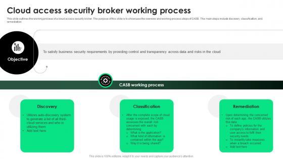 This slide outlines the working process of a cloud access security broker. The purpose of this slide is to showcase the overview and working process steps of CASB. The main steps include discovery, classification, and remediation. Here you can discover an assortment of the finest PowerPoint and Google Slides templates. With these templates, you can create presentations for a variety of purposes while simultaneously providing your audience with an eye-catching visual experience. Download CASB 2 0 IT Cloud Access Security Broker Working Process to deliver an impeccable presentation. These templates will make your job of preparing presentations much quicker, yet still, maintain a high level of quality. Slidegeeks has experienced researchers who prepare these templates and write high-quality content for you. Later on, you can personalize the content by editing the CASB 2 0 IT Cloud Access Security Broker Working Process. This slide outlines the working process of a cloud access security broker. The purpose of this slide is to showcase the overview and working process steps of CASB. The main steps include discovery, classification, and remediation.