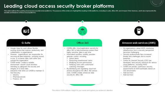 This slide outlines the Leading cloud access security broker platforms. The purpose of this slide is to highlight the leading CASB platforms, including G-suite, office 365, and Amazon Web Services, and it also represents the benefits and features of these cloud platforms. There are so many reasons you need a CASB 2 0 IT Leading Cloud Access Security Broker Platforms. The first reason is you can not spend time making everything from scratch, Thus, Slidegeeks has made presentation templates for you too. You can easily download these templates from our website easily. This slide outlines the Leading cloud access security broker platforms. The purpose of this slide is to highlight the leading CASB platforms, including G-suite, office 365, and Amazon Web Services, and it also represents the benefits and features of these cloud platforms.