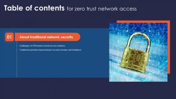 Find highly impressive Table Of Contents Zero Trust Network Access Ppt File Deck on Slidegeeks to deliver a meaningful presentation. You can save an ample amount of time using these presentation templates. No need to worry to prepare everything from scratch because Slidegeeks experts have already done a huge research and work for you. You need to download Table Of Contents Zero Trust Network Access Ppt File Deck for your upcoming presentation. All the presentation templates are 100 percent editable and you can change the color and personalize the content accordingly. Download now Our Table Of Contents Zero Trust Network Access Ppt File Deck are topically designed to provide an attractive backdrop to any subject. Use them to look like a presentation pro.