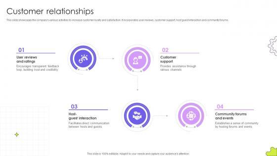 This slide showcases the companys various activities to increase customer loyalty and satisfaction. It incorporates user reviews, customer support, host guest interaction and community forums. Retrieve professionally designed Customer Relationships Guest Accommodation Service Business Model BMC SS V to effectively convey your message and captivate your listeners. Save time by selecting pre-made slideshows that are appropriate for various topics, from business to educational purposes. These themes come in many different styles, from creative to corporate, and all of them are easily adjustable and can be edited quickly. Access them as PowerPoint templates or as Google Slides themes. You do not have to go on a hunt for the perfect presentation because Slidegeeks got you covered from everywhere. This slide showcases the companys various activities to increase customer loyalty and satisfaction. It incorporates user reviews, customer support, host guest interaction and community forums.
