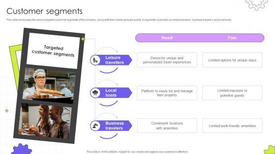 This slide showcases the various targeted customer segments of the company, along with their needs and pain points. It segments customers as leisure travelers, business travelers and local hosts. Slidegeeks has constructed Customer Segments Guest Accommodation Service Business Model BMC SS V after conducting extensive research and examination. These presentation templates are constantly being generated and modified based on user preferences and critiques from editors. Here, you will find the most attractive templates for a range of purposes while taking into account ratings and remarks from users regarding the content. This is an excellent jumping-off point to explore our content and will give new users an insight into our top-notch PowerPoint Templates. This slide showcases the various targeted customer segments of the company, along with their needs and pain points. It segments customers as leisure travelers, business travelers and local hosts.