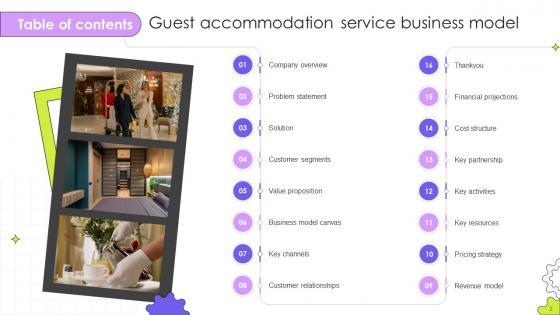 There are so many reasons you need a Table Of Contents Guest Accommodation Service Business Model BMC SS V. The first reason is you can not spend time making everything from scratch, Thus, Slidegeeks has made presentation templates for you too. You can easily download these templates from our website easily. Our Table Of Contents Guest Accommodation Service Business Model BMC SS V are topically designed to provide an attractive backdrop to any subject. Use them to look like a presentation pro.