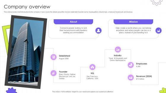 This slide provides brief introduction to the company. It also covers the details about the mission statement, founder name, headquarters, industry type, employee headcount, and revenue. The Company Overview Guest Accommodation Service Business Model BMC SS V is a compilation of the most recent design trends as a series of slides. It is suitable for any subject or industry presentation, containing attractive visuals and photo spots for businesses to clearly express their messages. This template contains a variety of slides for the user to input data, such as structures to contrast two elements, bullet points, and slides for written information. Slidegeeks is prepared to create an impression. This slide provides brief introduction to the company. It also covers the details about the mission statement, founder name, headquarters, industry type, employee headcount, and revenue.