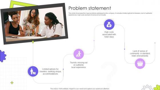 This slide showcases the major problems addressed by the company. It includes limited options for travelers, lack of authentic experiences, high costs and lack of sense of community. Create an editable Problem Statement Guest Accommodation Service Business Model BMC SS V that communicates your idea and engages your audience. Whether you are presenting a business or an educational presentation, pre-designed presentation templates help save time. Problem Statement Guest Accommodation Service Business Model BMC SS V is highly customizable and very easy to edit, covering many different styles from creative to business presentations. Slidegeeks has creative team members who have crafted amazing templates. So, go and get them without any delay. This slide showcases the major problems addressed by the company. It includes limited options for travelers, lack of authentic experiences, high costs and lack of sense of community.
