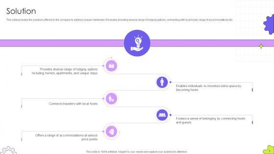 This slide provides the solutions offered by the company to address issues mentioned. It includes providing diverse range of lodging options, connecting with local hosts, range of accommodations etc. Want to ace your presentation in front of a live audience Our Solution Guest Accommodation Service Business Model BMC SS V can help you do that by engaging all the users towards you. Slidegeeks experts have put their efforts and expertise into creating these impeccable powerpoint presentations so that you can communicate your ideas clearly. Moreover, all the templates are customizable, and easy-to-edit and downloadable. Use these for both personal and commercial use. This slide provides the solutions offered by the company to address issues mentioned. It includes providing diverse range of lodging options, connecting with local hosts, range of accommodations etc.