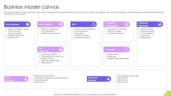 This slide provides the companys business model canvas to understand its overall business functioning. It involves key partners, key activities, USP, customer relationships, customer segments, channels, revenue streams, key resources, and cost structure. The best PPT templates are a great way to save time, energy, and resources. Slidegeeks have 100 percent editable powerpoint slides making them incredibly versatile. With these quality presentation templates, you can create a captivating and memorable presentation by combining visually appealing slides and effectively communicating your message. Download Business Model Canvas Guest Accommodation Service Business Model BMC SS V from Slidegeeks and deliver a wonderful presentation. This slide provides the companys business model canvas to understand its overall business functioning. It involves key partners, key activities, USP, customer relationships, customer segments, channels, revenue streams, key resources, and cost structure.