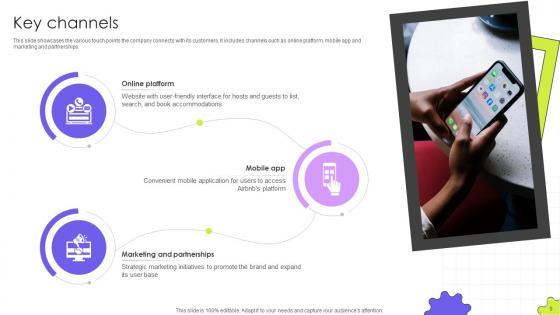 This slide showcases the various touch points the company connects with its customers. It includes channels such as online platform, mobile app and marketing and partnerships. Take your projects to the next level with our ultimate collection of Key Channels Guest Accommodation Service Business Model BMC SS V. Slidegeeks has designed a range of layouts that are perfect for representing task or activity duration, keeping track of all your deadlines at a glance. Tailor these designs to your exact needs and give them a truly corporate look with your own brand colors they will make your projects stand out from the rest This slide showcases the various touch points the company connects with its customers. It includes channels such as online platform, mobile app and marketing and partnerships.