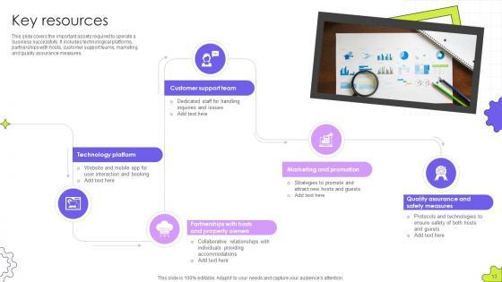 This slide covers the important assets required to operate a business successfully. It includes technological platforms, partnerships with hosts, customer support teams, marketing and quality assurance measures. Find a pre-designed and impeccable Key Resources Guest Accommodation Service Business Model BMC SS V. The templates can ace your presentation without additional effort. You can download these easy-to-edit presentation templates to make your presentation stand out from others. So, what are you waiting for Download the template from Slidegeeks today and give a unique touch to your presentation. This slide covers the important assets required to operate a business successfully. It includes technological platforms, partnerships with hosts, customer support teams, marketing and quality assurance measures.