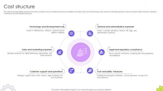 This slide showcases all the expenses and costs a company incurs to operate its business successfully. It includes costs such as technology costs, sales and marketing expenses, customer support, safety measures, regulatory compliance and administrative expenses. Are you searching for a Cost Structure Guest Accommodation Service Business Model BMC SS V that is uncluttered, straightforward, and original Its easy to edit, and you can change the colors to suit your personal or business branding. For a presentation that expresses how much effort you have put in, this template is ideal With all of its features, including tables, diagrams, statistics, and lists, its perfect for a business plan presentation. Make your ideas more appealing with these professional slides. Download Cost Structure Guest Accommodation Service Business Model BMC SS V from Slidegeeks today. This slide showcases all the expenses and costs a company incurs to operate its business successfully. It includes costs such as technology costs, sales and marketing expenses, customer support, safety measures, regulatory compliance and administrative expenses.