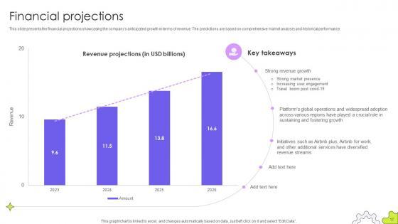 This slide presents the financial projections showcasing the companys anticipated growth in terms of revenue. The predictions are based on comprehensive market analysis and historical performance. Presenting this PowerPoint presentation, titled Financial Projections Guest Accommodation Service Business Model BMC SS V, with topics curated by our researchers after extensive research. This editable presentation is available for immediate download and provides attractive features when used. Download now and captivate your audience. Presenting this Financial Projections Guest Accommodation Service Business Model BMC SS V. Our researchers have carefully researched and created these slides with all aspects taken into consideration. This is a completely customizable Financial Projections Guest Accommodation Service Business Model BMC SS V that is available for immediate downloading. Download now and make an impact on your audience. Highlight the attractive features available with our PPTs. This slide presents the financial projections showcasing the companys anticipated growth in terms of revenue. The predictions are based on comprehensive market analysis and historical performance.