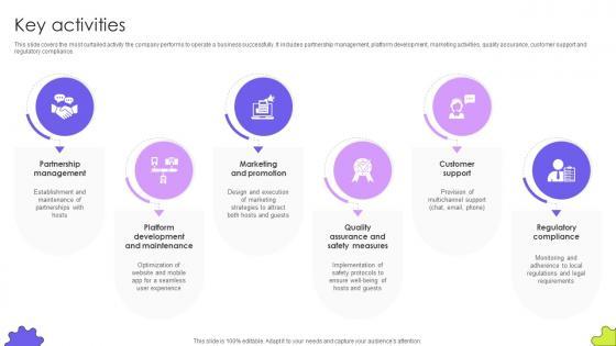 This slide covers the most curtailed activity the company performs to operate a business successfully. It includes partnership management, platform development, marketing activities, quality assurance, customer support and regulatory compliance. This Key Activities Guest Accommodation Service Business Model BMC SS V from Slidegeeks makes it easy to present information on your topic with precision. It provides customization options, so you can make changes to the colors, design, graphics, or any other component to create a unique layout. It is also available for immediate download, so you can begin using it right away. Slidegeeks has done good research to ensure that you have everything you need to make your presentation stand out. Make a name out there for a brilliant performance. This slide covers the most curtailed activity the company performs to operate a business successfully. It includes partnership management, platform development, marketing activities, quality assurance, customer support and regulatory compliance.